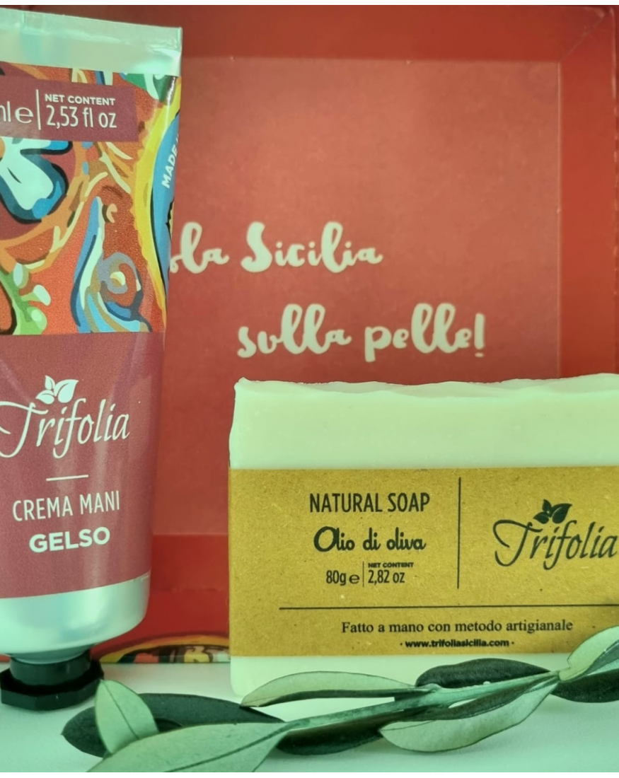 "ORANGE BLOSSOM" SOAP: Trifolia "Orange Blossom" soap made by hand and all stages of production, based on Olive and Almond Oil, rich in natural emollient and soothing substances. The soap, with a fresh, citrus scent, is decorated with delicious slices of dried Sicilian oranges.