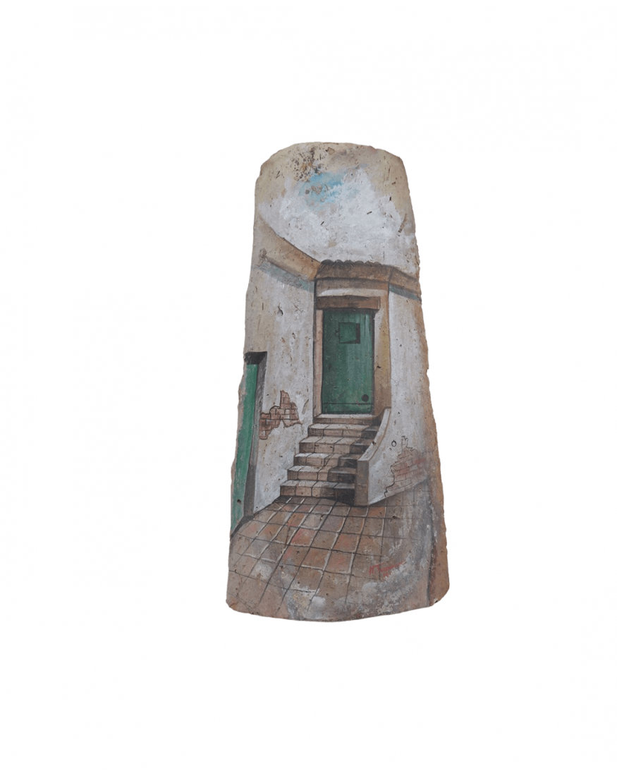 Tegola artigianale di Caltagirone realizzata in terracotta incisa e decorata a mano da artisti che mettono in luce angoli rari del territorio isolano della prima metà dell'XX secolo.