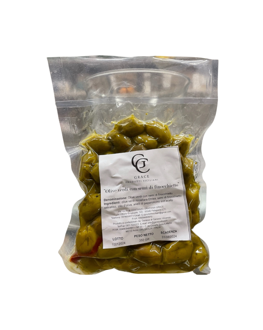 Olive verdi Nocella dell'Etna con semi di finocchietto selvatico,olio d’ oliva e anelli di peperoncino