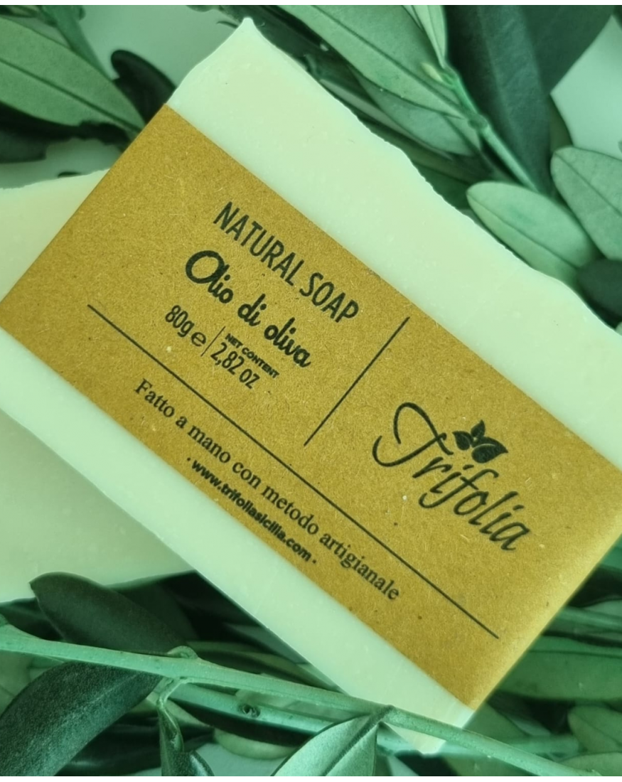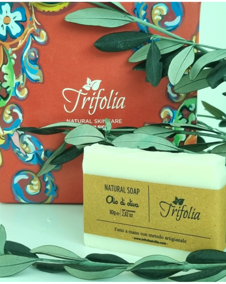 - SAPONE “OLIO D'OLIVA”: realizzato a mano e tutte le fasi di produzione, a base di Olio di Oliva, ricco di antiossidanti e di sostanze emollienti e lenitive naturali. emollienti e lenitive naturali. Il sapone, dalla profumazione fresca e agrumata, si presenta decorato con deliziose fette di arance siciliane essiccate.