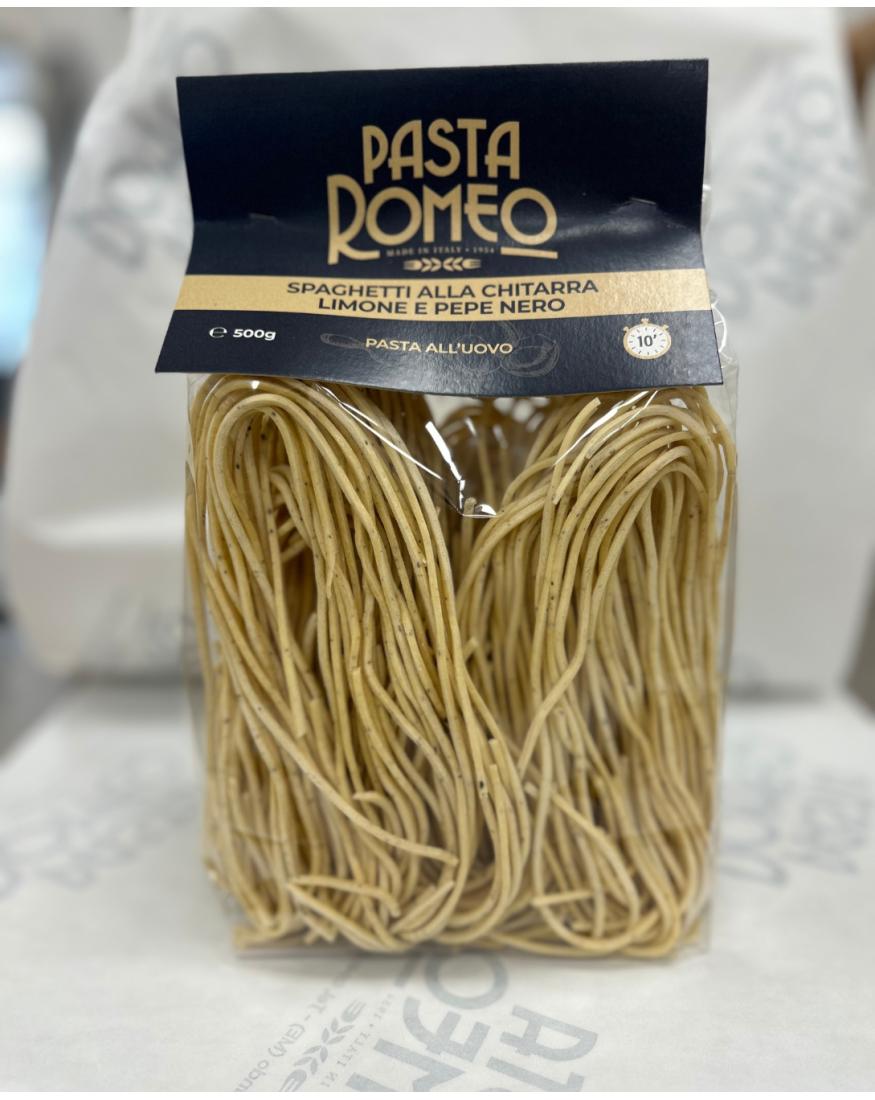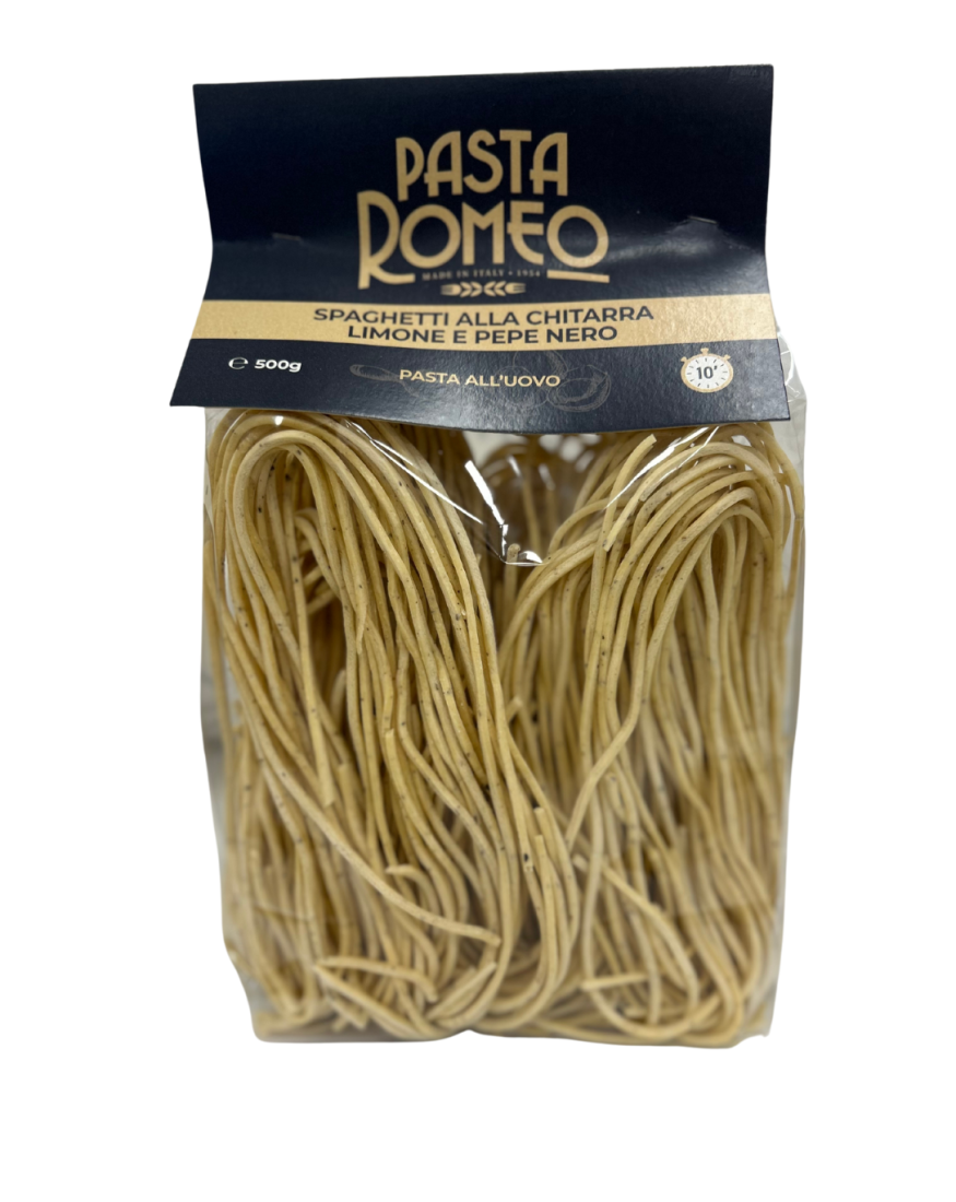 Gli Spaghetti alla Chitarra al Limone e Pepe Nero sono un prodotto artigianale di alta qualità, realizzato con cura dai maestri pastai siciliani. Preparati con semola di grano duro selezionata, uova fresche, scorza di limone e pepe nero macinato, questi spaghetti offrono un sapore fresco e speziato. La loro caratteristica forma quadrata è ottenuta attraverso l'uso della tradizionale chitarra abruzzese, che garantisce una consistenza perfetta. Il processo di lavorazione segue rigorosamente antiche ricette tramandate da generazioni, assicurando un gusto autentico.