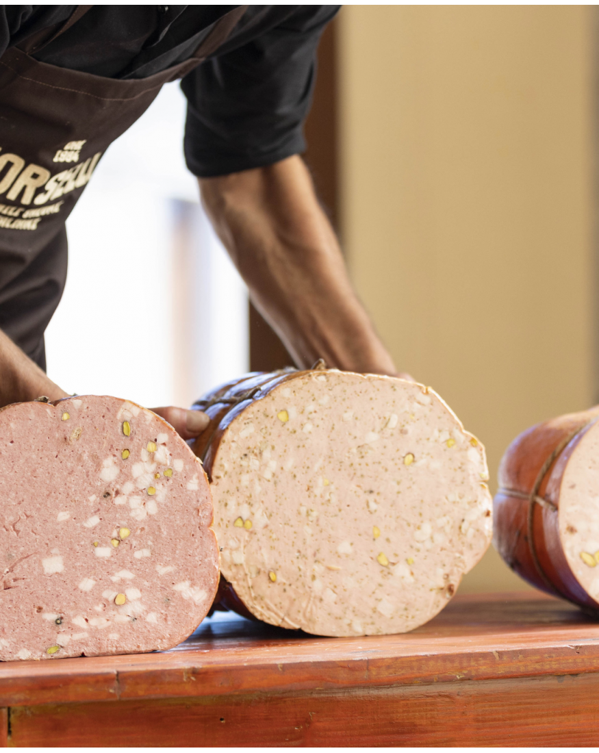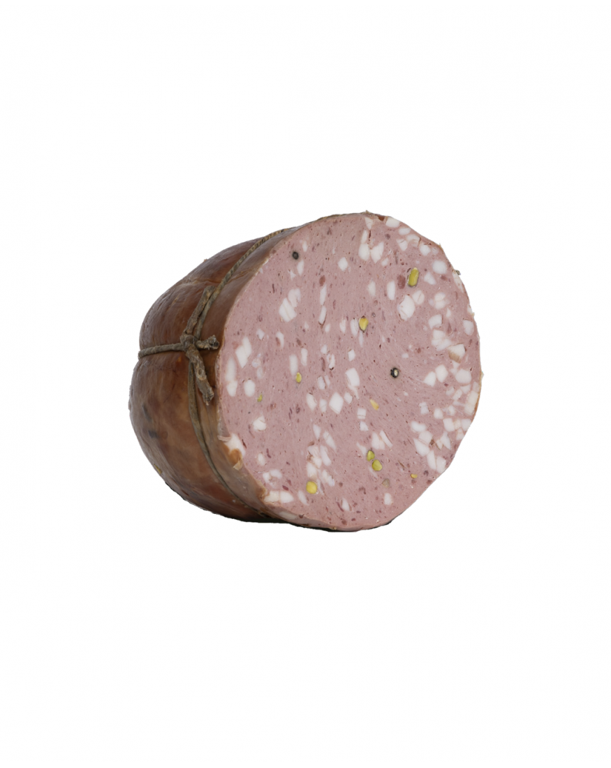 Pezzo legato a mano e insaccato in vescica naturale. Carne di pecora siciliana, pepe indiano e pistacchio locale. Scadenza 90 giorni.